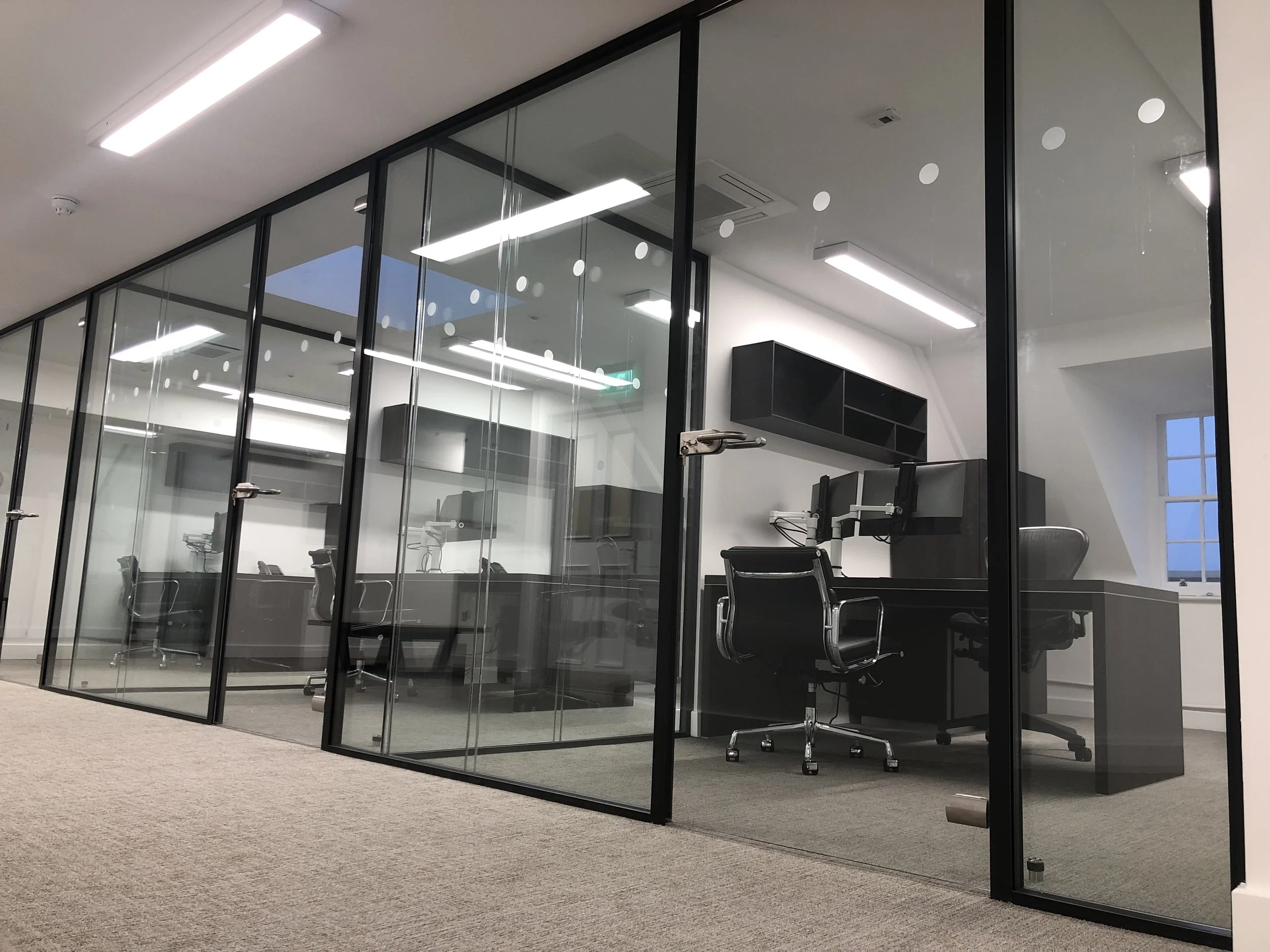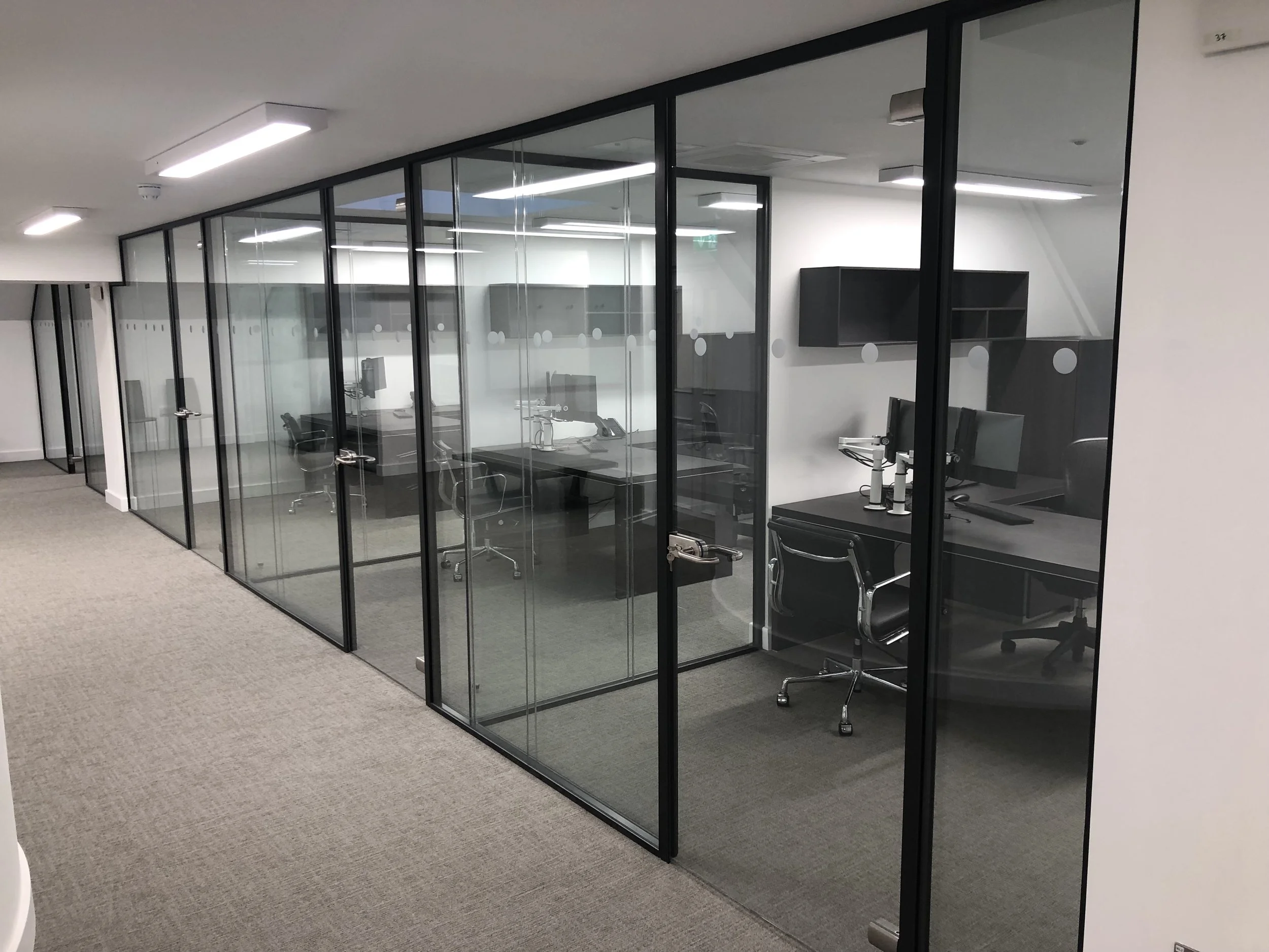 Work Carried Out: DG64 double glazed office partitions with slimline framed single door door sets (ClariTec Series).